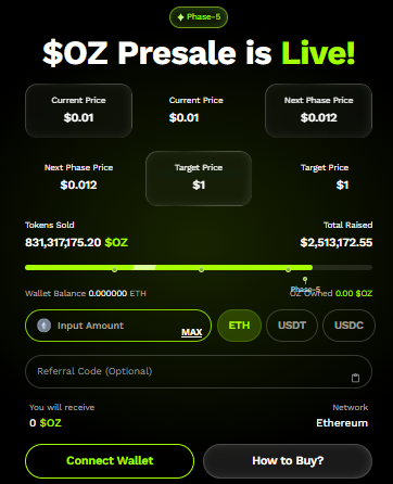 At present, Ozak AI is in Phase 5 of its presale. The token price stands at the present value of $0.01 and the next level is set at $0.012. More than 831 million tokens have already been sold, raising over $2.51 million.