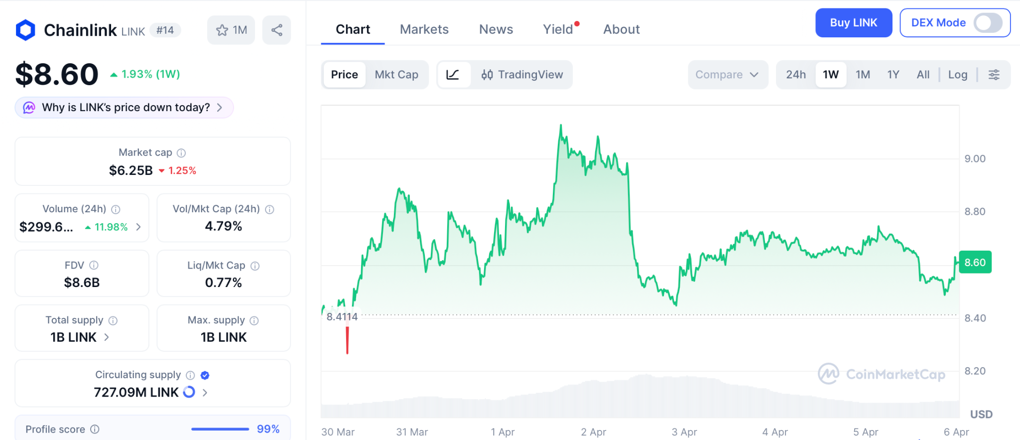 LINK sits at $8.60 as of April 5, down 84% from its cycle high of $52.70, per CoinMarketCap.