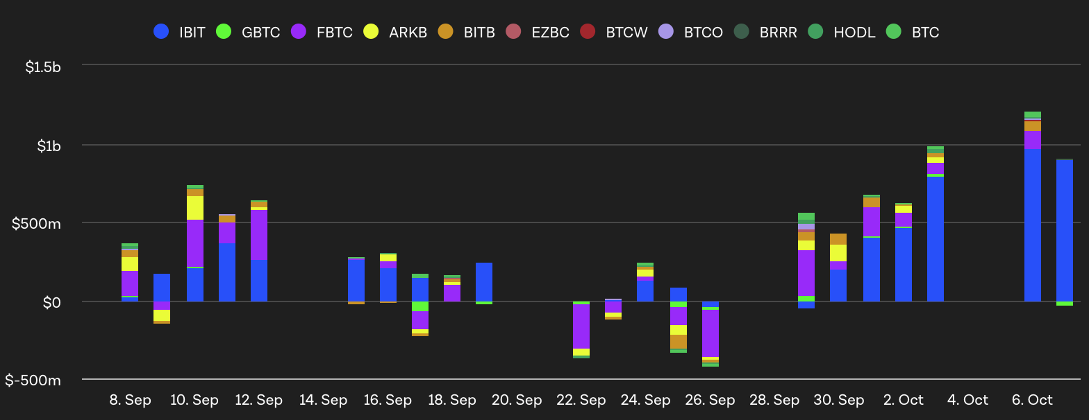 Bitcoin can’t stop proving why it’s the ultimate king of crypto. U.S. spot Bitcoin ETFs saw over $1 billion in net inflows on October 6, 2025. That’s the biggest spike since July. And nearly $970 million of that $1 billion came from BlackRock’s IBIT fund alone.