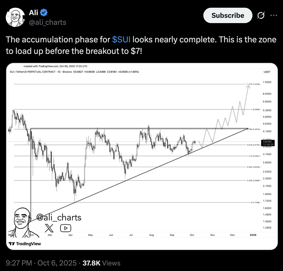 Market analyst Ali, for example, believes the accumulation phase could now be over and that this is the zone to load up before the SUI price heads toward $7.