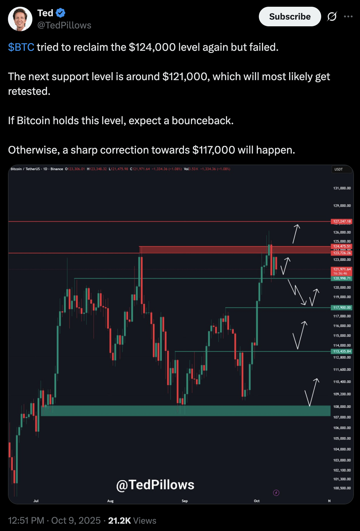 Thanks to so much confidence from investors, BTC has also hit a fresh all-time high of $126,000 before cooling to around $123,000. Analyst TedPillows believes Bitcoin could very well retest $121,000 before bouncing back. But if the top crypto coin slips, its price can correct to $117,000.