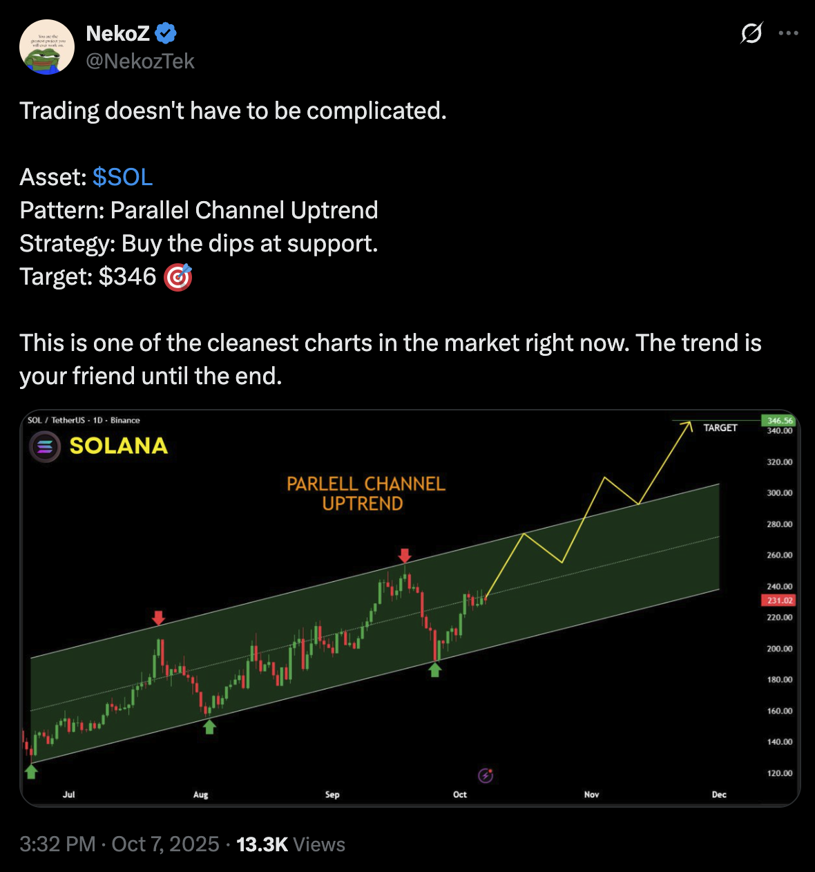 Chart expert NekoZ calls SOL “one of the cleanest charts in the market.” The analyst is watching a parallel channel uptrend with an ambitious target of $346 for SOL. That’s a 57% climb from here.