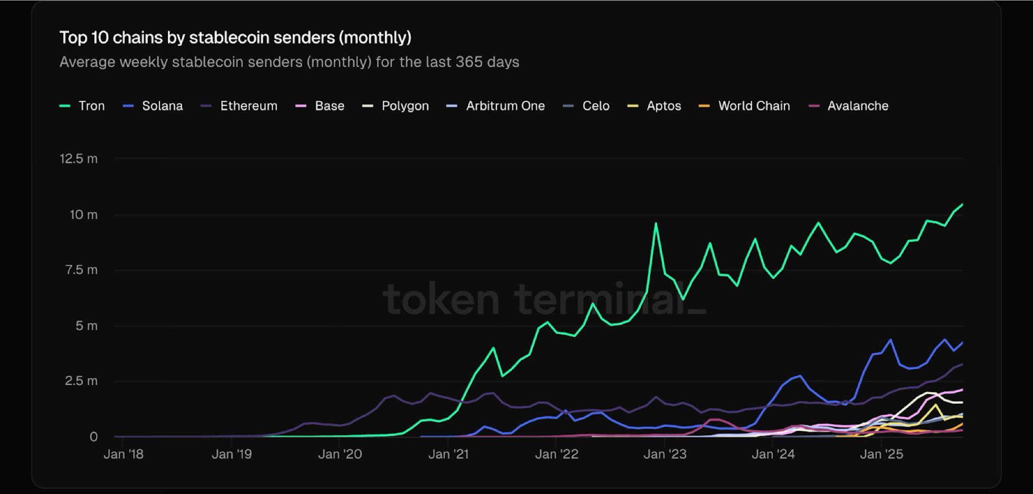 TRON continues to prove why it’s so important in the blockchain space. According to Token Terminal, it leads all networks in monthly stablecoin senders, far ahead of Solana and Ethereum.