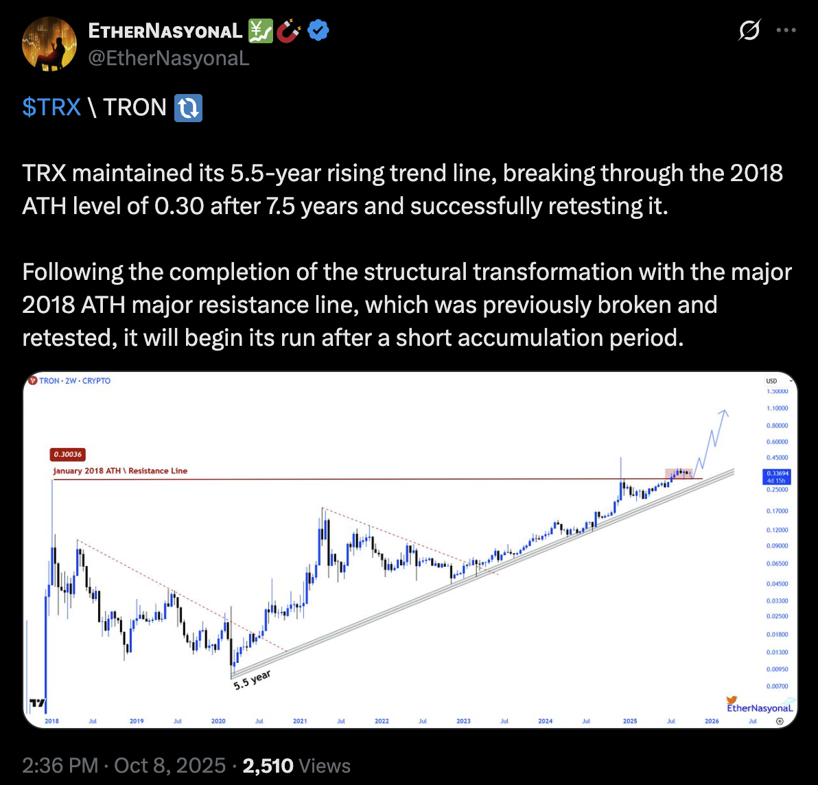 Market analyst EtherNasyonaL points out that TRON recently broke through its 2018 all-time high of $0.300. TRX has now successfully retested its previous ATH. And the analyst expects “a major run after a short accumulation phase.”