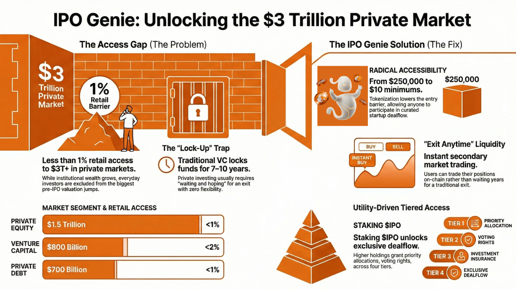 That’s the problem IPO Genie is built to solve. The IPO Genie platform aims to bridge blockchain and private markets by giving everyday users access to institutional-style venture and pre-IPO opportunities. With on-chain transparency, tiered access, staking, and secondary liquidity.