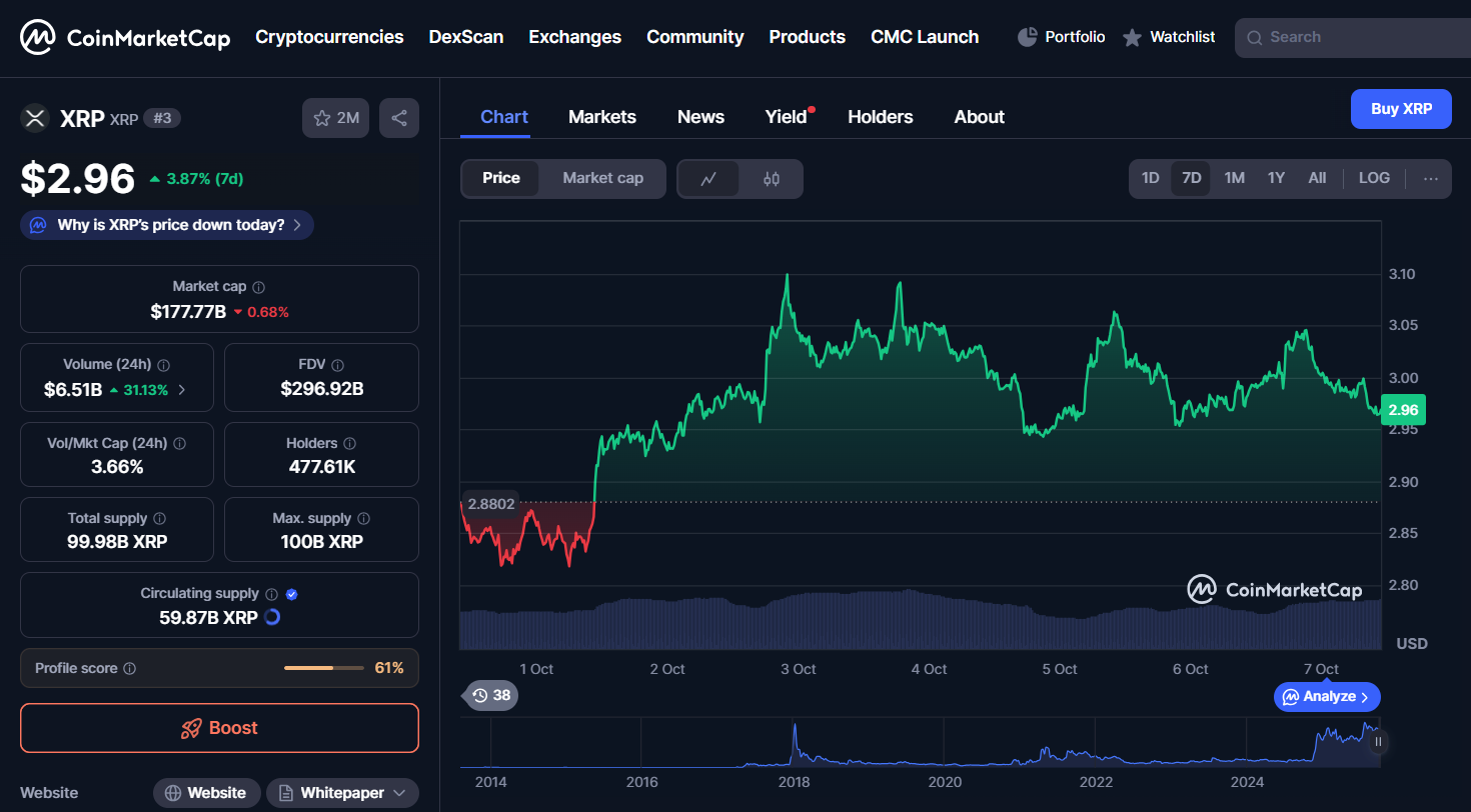 XRP’s price is currently trading at $2.96, a 3.87% rise in the past 7 days. XRP’s trading volume has also increased by 31.13% in the past 24 hours alone, indicating a heightened response from the market. However, its market cap has decreased by 0.68% in the past day, which shows that the market is still treading carefully when it comes to XRP.