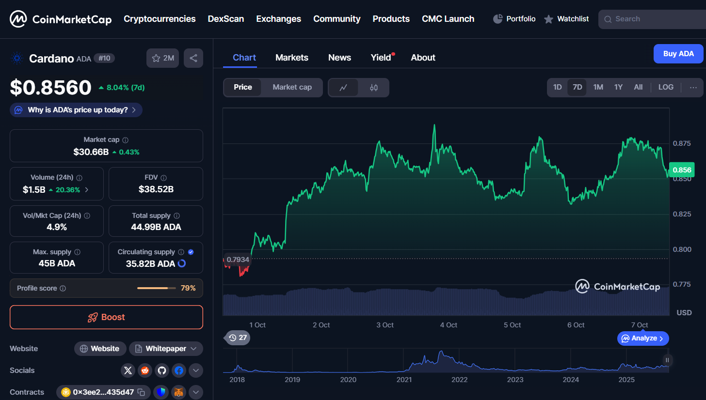 ADA is in a similar boat as XRP, as it too suffered losses during the market-wide dump. Now, the ADA price is rising slowly, currently at $0.8560. The recovery might have also been prompted by Cardano whales, as they bought 70 million ADA tokens in the last week of September/beginning of October 2025.