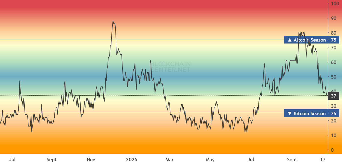The Blockchain Center’s Altseason Index stands at 37 out of 100. This represents the lowest level since July.