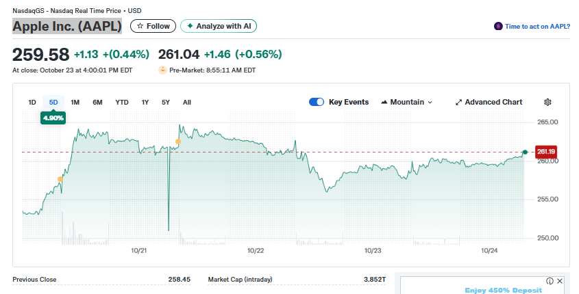 Apple Inc. (NASDAQ: AAPL) stock traded relatively flat on Friday, closing at $259.58 (+0.44%) and inching slightly higher to $261.35 (+0.68%) in pre-market trading, according to Nasdaq Real Time Price data.