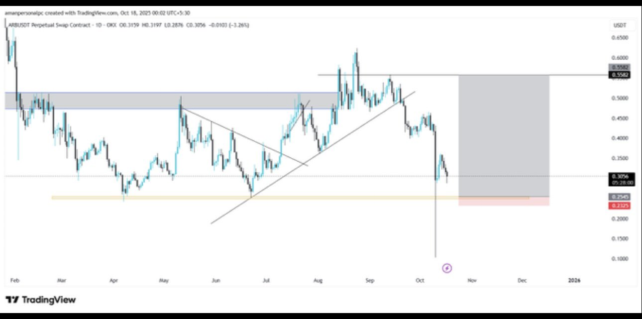 Despite broader market pressure, Arbitrum’s price structure remains resilient. The asset has consistently defended the $0.25 support zone, which analysts interpret as a major accumulation area for whales. According to market data, Arbitrum trades around $0.3098, marking a 1.29 percent increase over the last 24 hours and maintaining a market capitalization of approximately $1.7 billion.
