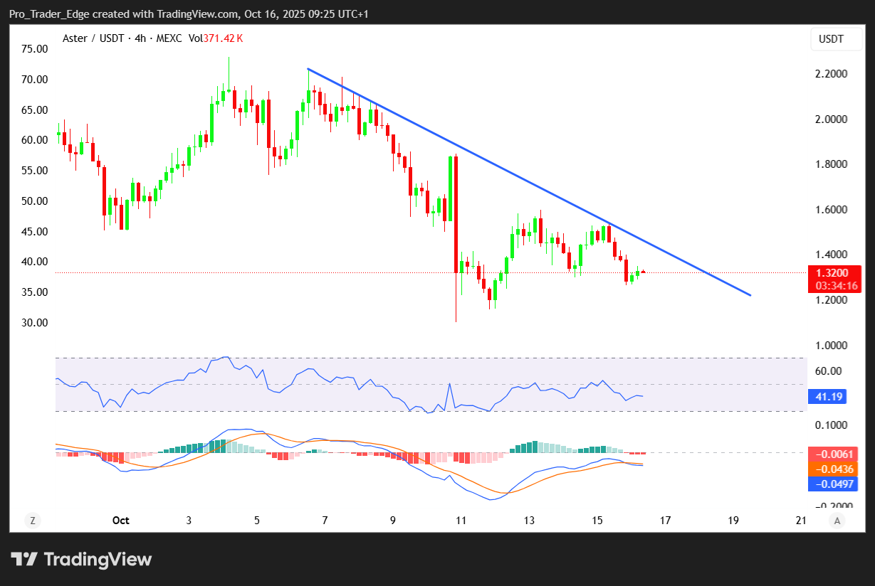 ASTER trades inside a descending triangle on the 4-hour chart. The token must close above $1.59 to invalidate the bearish setup.