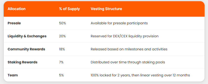 - It has defined tokenomics: presale allocation, liquidity/exchange allocation, rewards, staking, and team vesting are publicly listed.