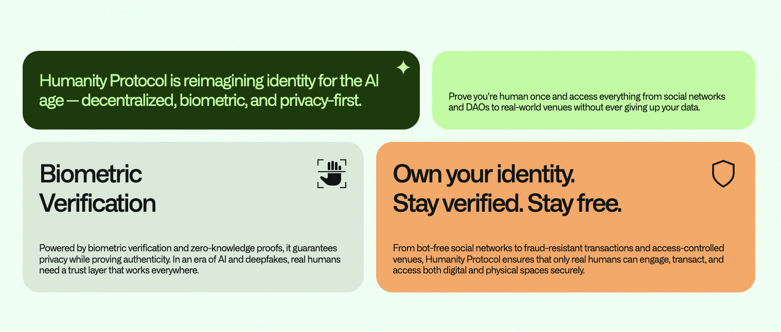 Humanity Protocol (H) is in one of crypto’s most interesting niches – the fight to prove you’re human. It’s building a decentralized identity layer powered by zero-knowledge tech and palm-recognition-style verification, letting users confirm they’re real people without exposing their personal data.