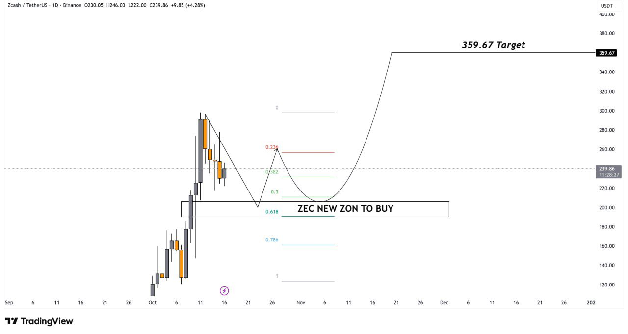 Elom identified a cup-and-handle pattern forming on the chart, a structure often associated with major upside breakouts. Based on this formation, the projected target for Zcash stands near $359.60, signaling a potentially significant upside from current levels if momentum continues.