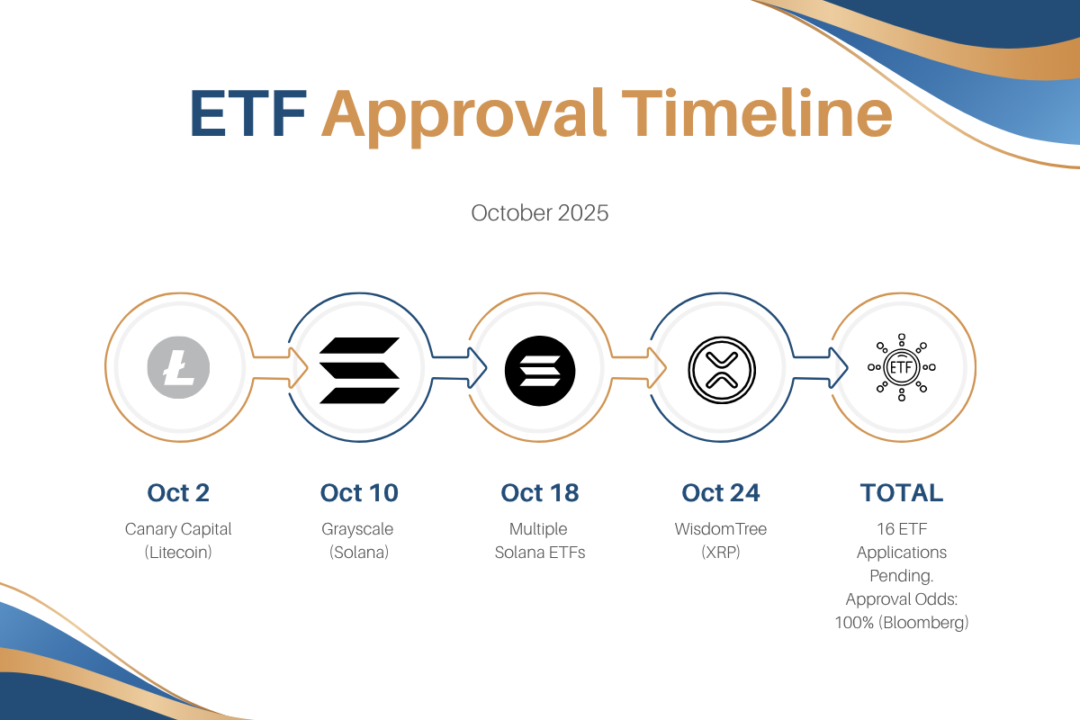 The SEC faces 16 altcoin ETF decisions this October, with deadlines scattered throughout the month for Solana, XRP, Litecoin, and Dogecoin funds. Analysts predict these approvals could spark the long-awaited altcoin rally, with Bloomberg’s Eric Balchunas placing approval odds at 100% after the SEC introduced generic listing standards for crypto ETPs.