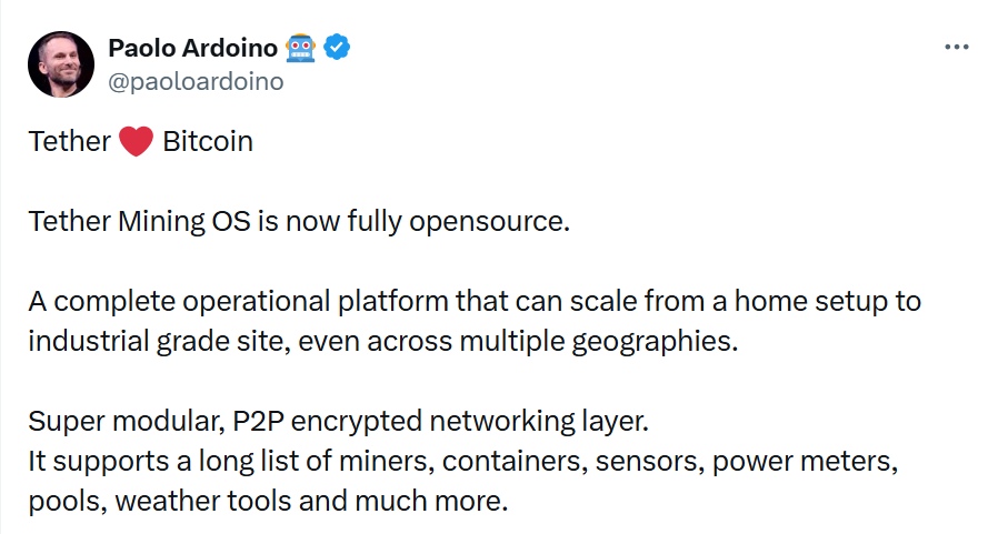 According to a post by Tether’s CEO, Paolo Ardoino, this mining software can support mining operations across multiple locations, making it suitable for home to industrial-scale mining setups.