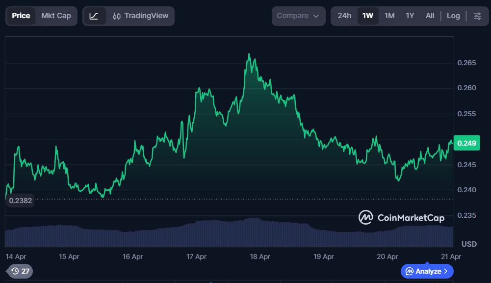 Cardano is trading at $0.2488 following a 1% gain in the last 24 hours, with the weekly gain of 3.5% pointing to the overall setup being bullish. The 24-hour range of $0.2449 to $0.2519 is tight enough to indicate ADA’s regulated trade rather than disruptive selling.