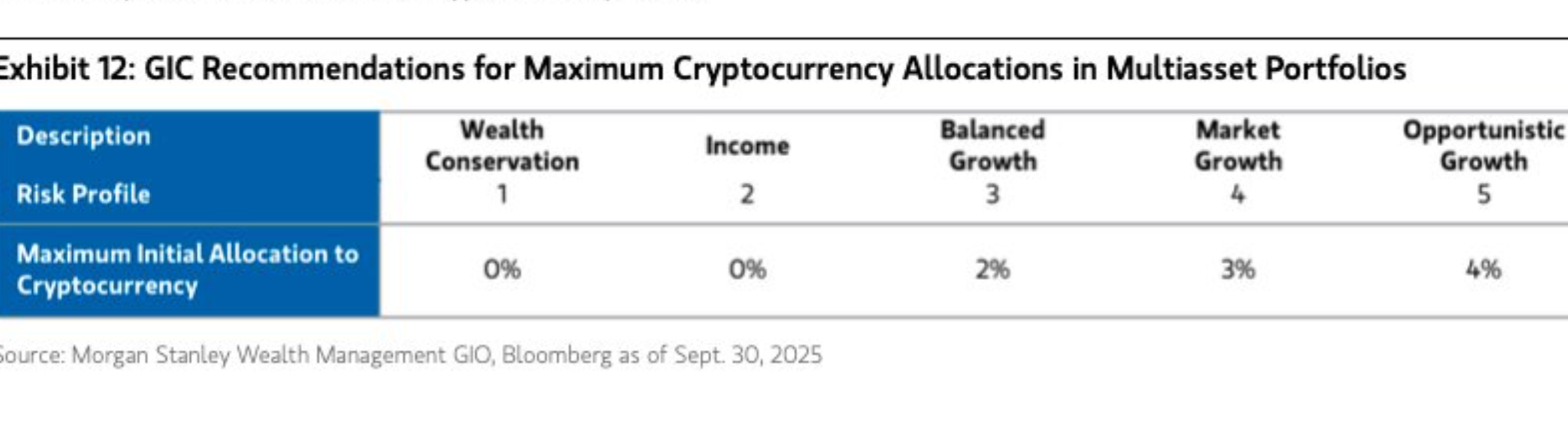 Morgan Stanley’s October Global Investment Committee guidance laid out clear crypto thresholds across portfolio types. “Opportunistic Growth” mandates, built for higher risk and higher return, can allocate up to 4% to crypto. “Balanced Growth” portfolios, designed for moderate risk, can allocate up to 2% of their assets. Preservation-focused allocations remain at 0%, with the committee noting that crypto’s correlations and volatility can rise during periods of macro stress.