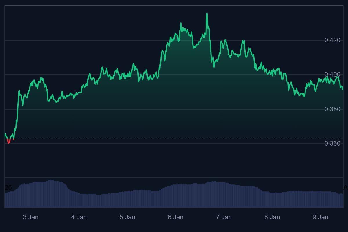 Cardano has started the new year with measurable upside, climbing roughly 12% over the first week of January 2026 as investors quietly add to positions. On January 3, ADA began trading near about $0.358, and by January 9, it had pushed up to around $0.398.