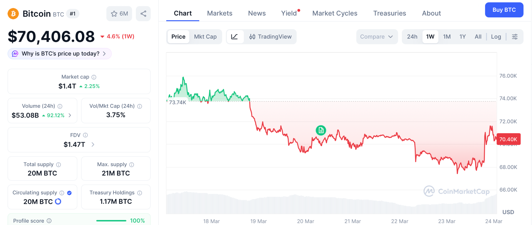 BTC trades near $70,406 as of March 23, recovering sharply from $68,500 after the Iran ceasefire signal, according to CoinMarketCap.