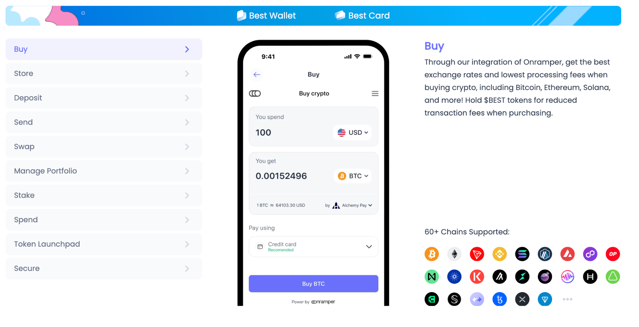 It also features a built-in cross-chain DEX that enables seamless swaps for tokens across any of the supported networks, while ensuring the best possible price through its use of the Onramper aggregator. Onramper also supports Best Wallet’s fiat on- and off-ramp capabilities, allowing users to move funds on and off-chain without needing to go through a centralized intermediary, such as a CEX.