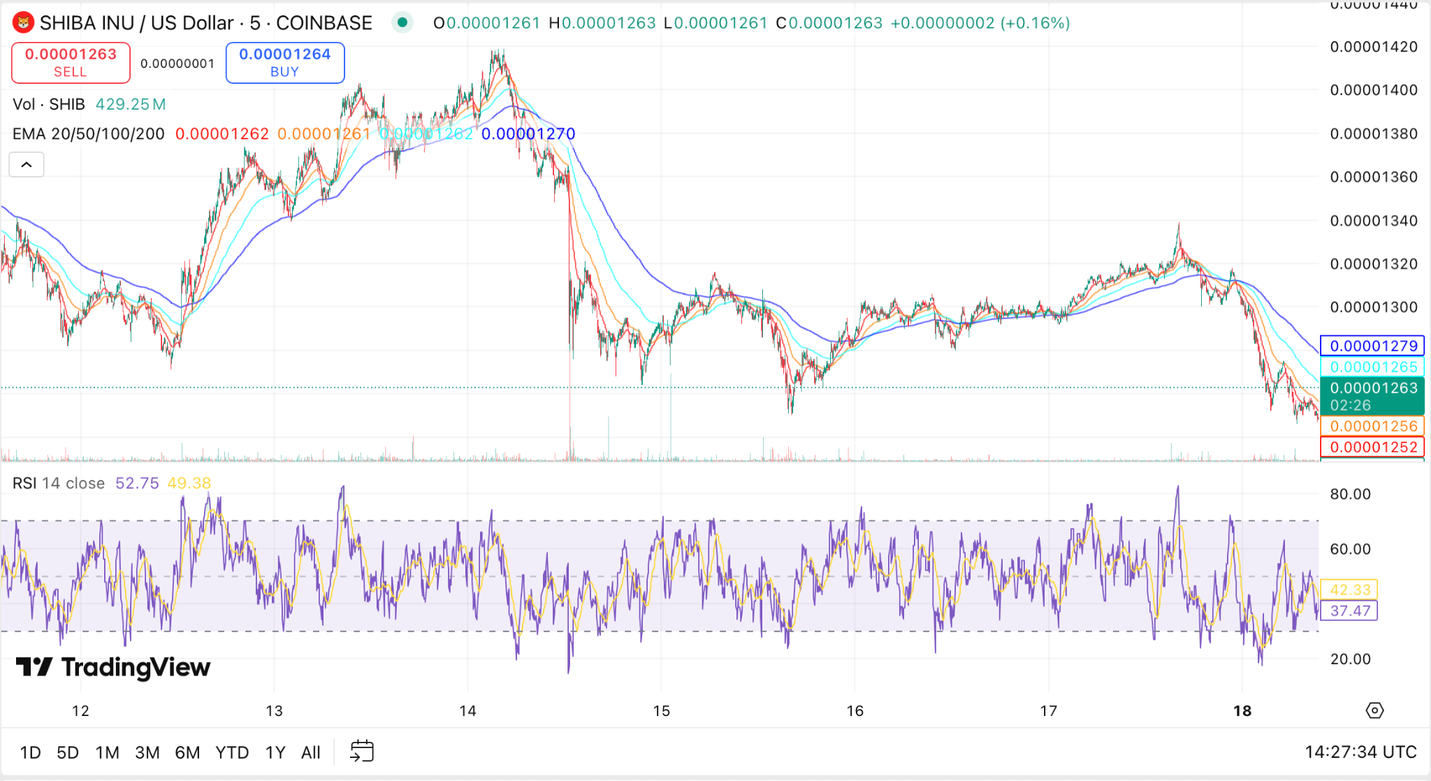 As of August 18, Shiba Inu is trading for $0.00001259 after a 4.51% intraday decline. The SHIB RSI is at 52.75, placing it in neutral territory but closer to oversold territory than overbought levels.