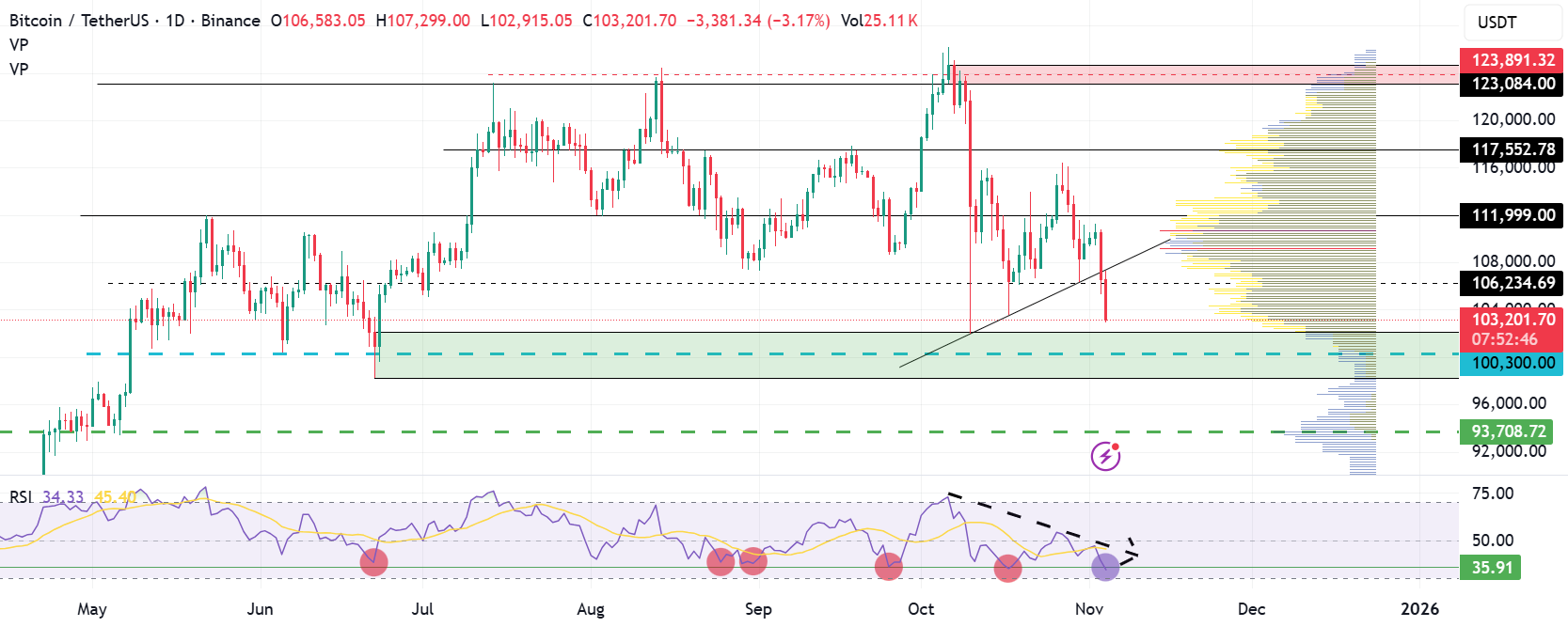 Looking at the daily chart, BTC seems to have broken an important support line. This could lead to lower prices, with targets of $100,000 and $93,000. If this happens, the whole market will probably fall along with it, which makes BTC still a better buy at the moment.