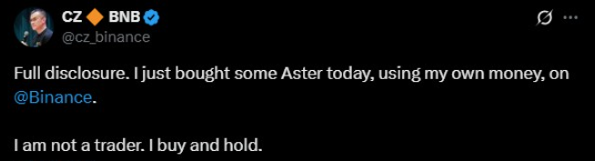 Binance founder Changpeng Zhao (CZ) triggered a 40% pump in ASTER after publicly announcing he had invested his own money in buying the token. In the transaction, CZ invested approximately $2 million, acquiring about 2 million tokens.