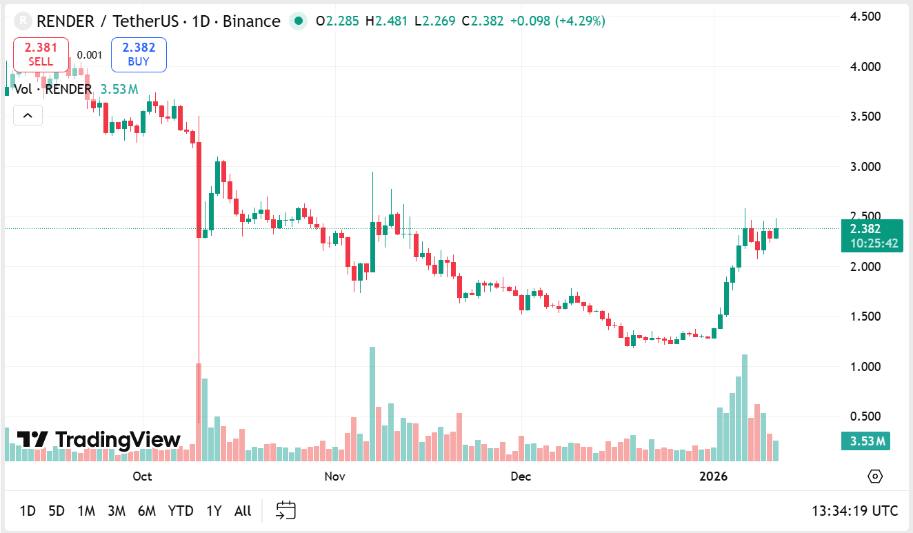 Render is one of the clearest crypto trends tied to AI demand. It focuses on distributed GPU compute for rendering and related workloads and it often moves with the wider “AI tokens” basket during strong market sentiment.