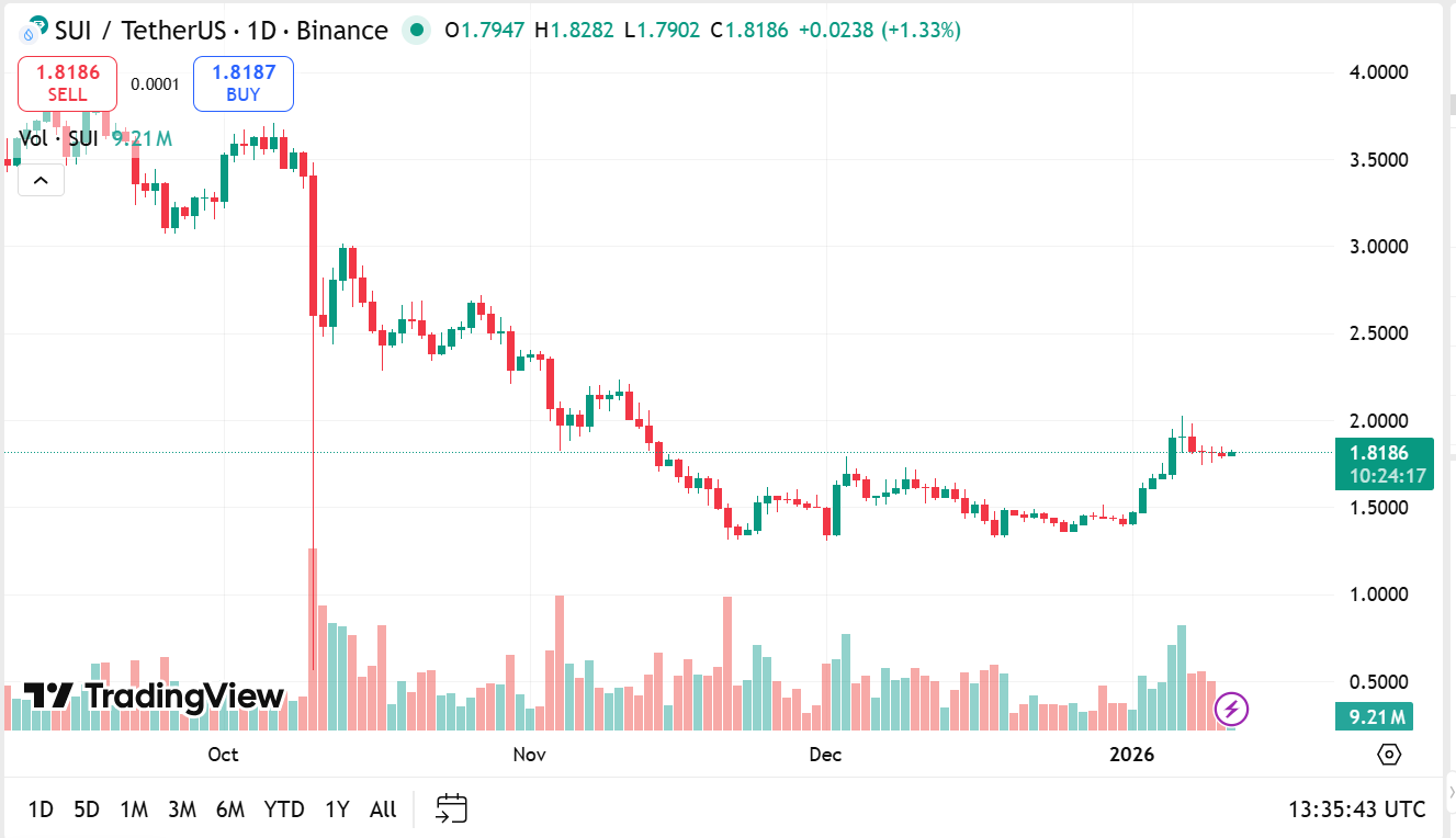 SUI trades around $1.819, with a 30-day change of +9.9%. That beats ETH’s monthly performance and keeps Sui on many best crypto to buy shortlists, even for investors who usually focus on bigger names.