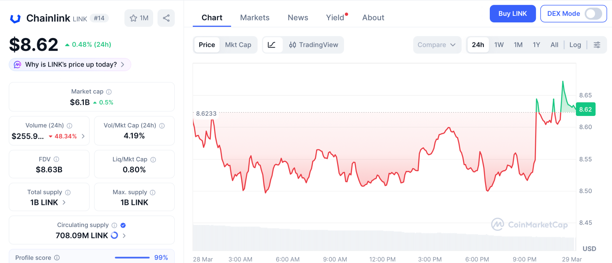 LINK held around $8.62 according to CoinMarketCap, with exchange reserves dropping 40% to 127 million as long term holders build positions.