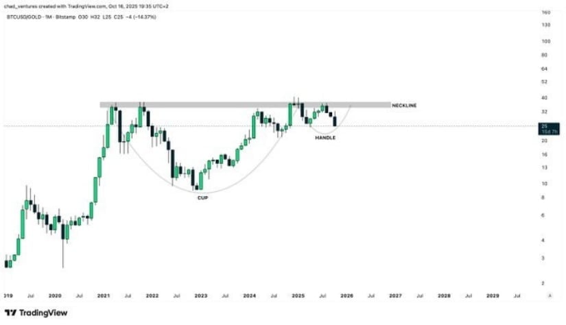 But bulls remain optimistic and have one more reason: the BTC/GOLD chart. This chart shows the relationship between Bitcoin and gold prices over the past few years, and it features a multi-year bullish cup-and-handle pattern. Typically, this pattern breaks to the upside, and this could push Bitcoin’s price to $120k and then above $130k.