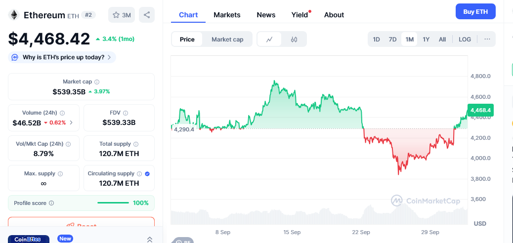 As of October 2, ETH stood at $4,393 following a 10% surge over the past week. ETH’s 30-day chart also shows a 2.51% rally.