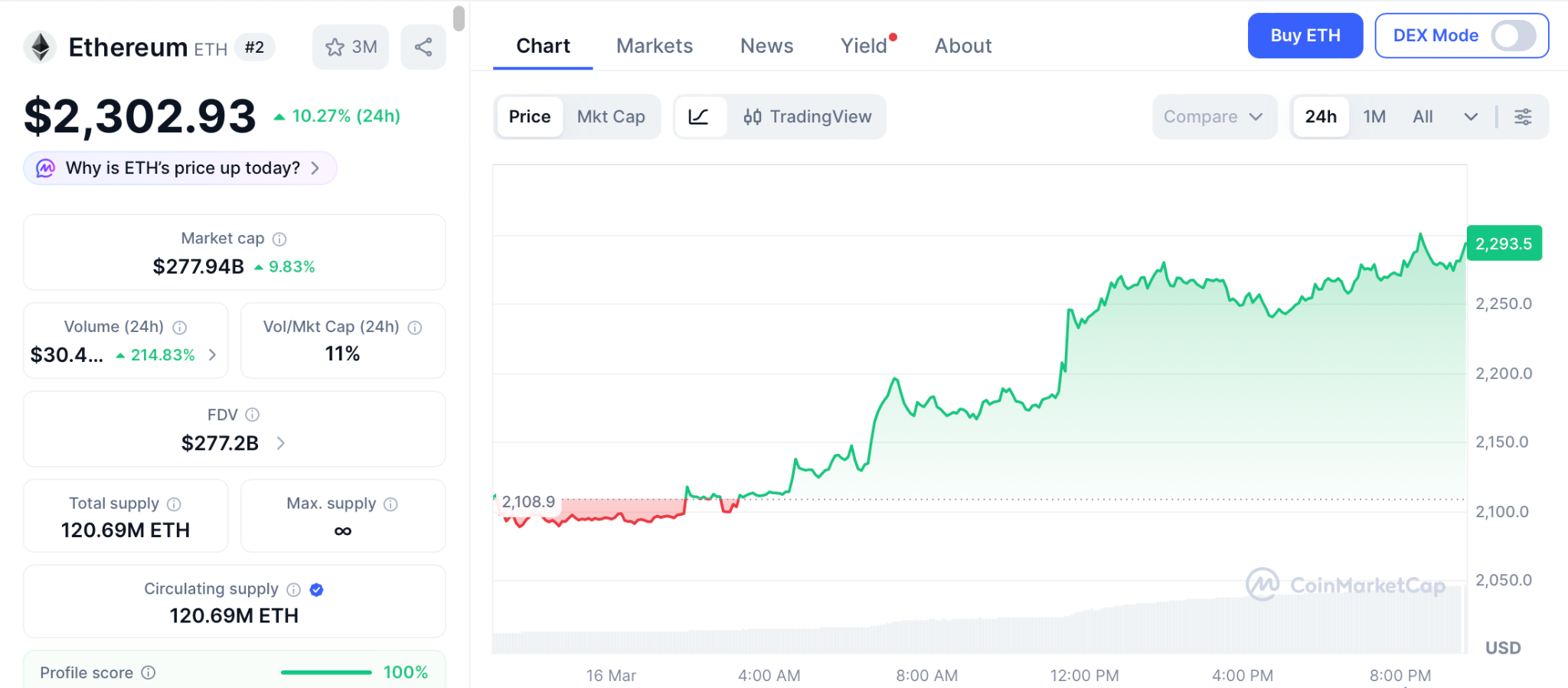 ETH trades at $2,302 on March 16 according to CoinMarketCap, awaiting a potential breakout. If resistance at $2,250 breaks, the next target area is $2,600 to $2,800.