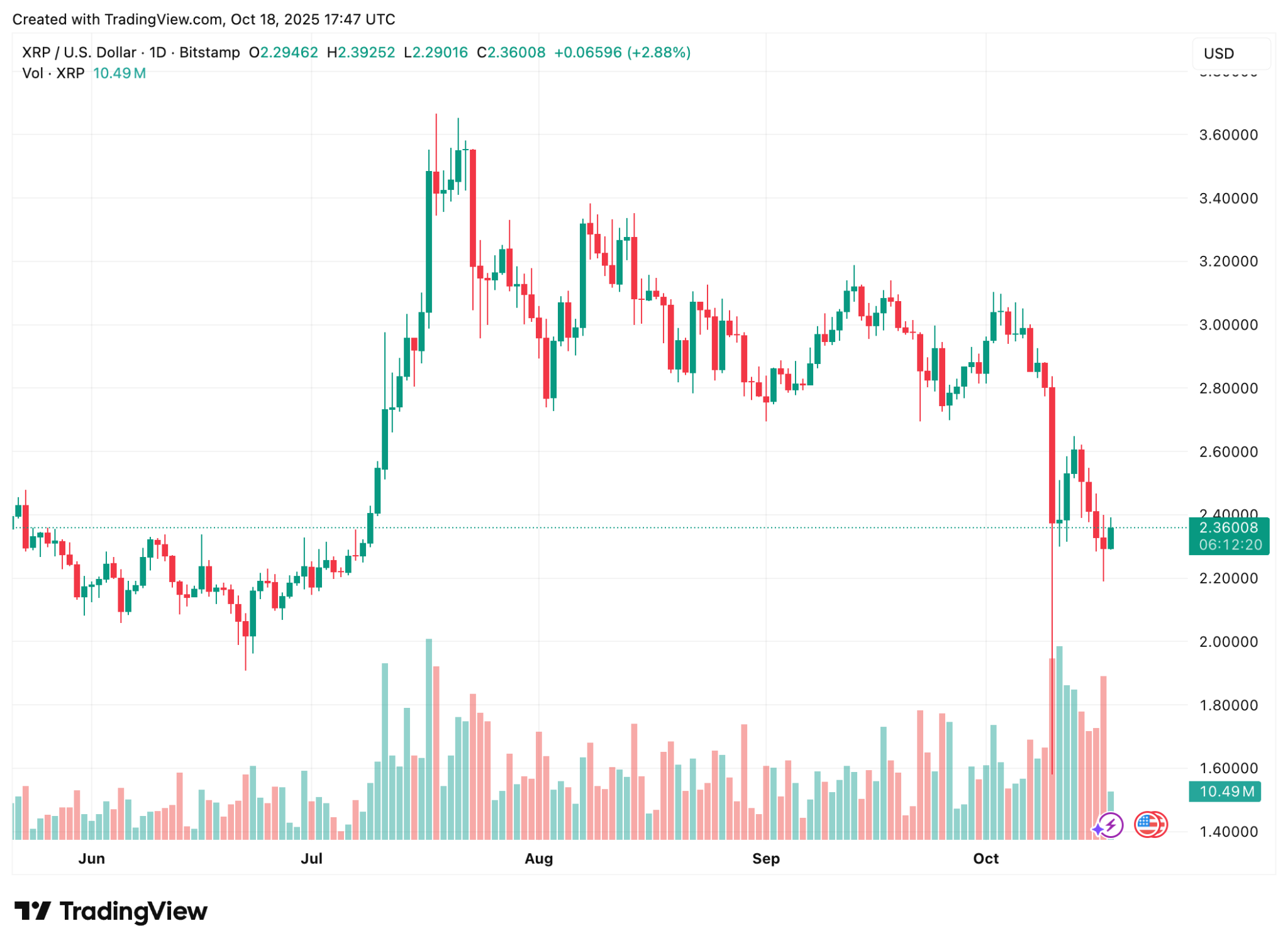 XRP slid to $1.20 during last week’s flush, then stabilized around $2.36. On-chain data shows falling exchange reserves and rising large transfers, a mix that often appears during early accumulation. The near-term range is $2.20 to $2.90. A strong close above $2.90 could invite $3.60–$3.80.