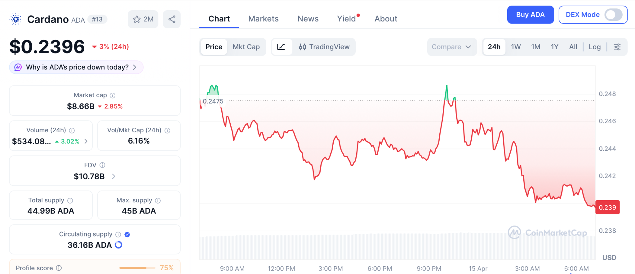 Cardano (ADA) sits at $0.2396 on April 15 per CoinMarketCap, down 92% from its $3.10 peak. Whale wallets holding over 10 million ADA reached a four-month high of 424 addresses, and the Protocol 11 hard fork with full on-chain governance is approaching, per CoinGecko.
