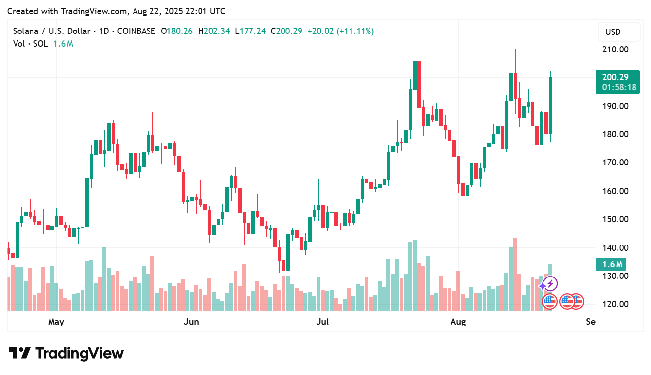 Notably, Solana sits at 0.8608 within its Bollinger Bands, close to the $202.53 upper band, a setup that often hints at further upside. The daily ATR of $11.74 confirms healthy volatility within the current trend.