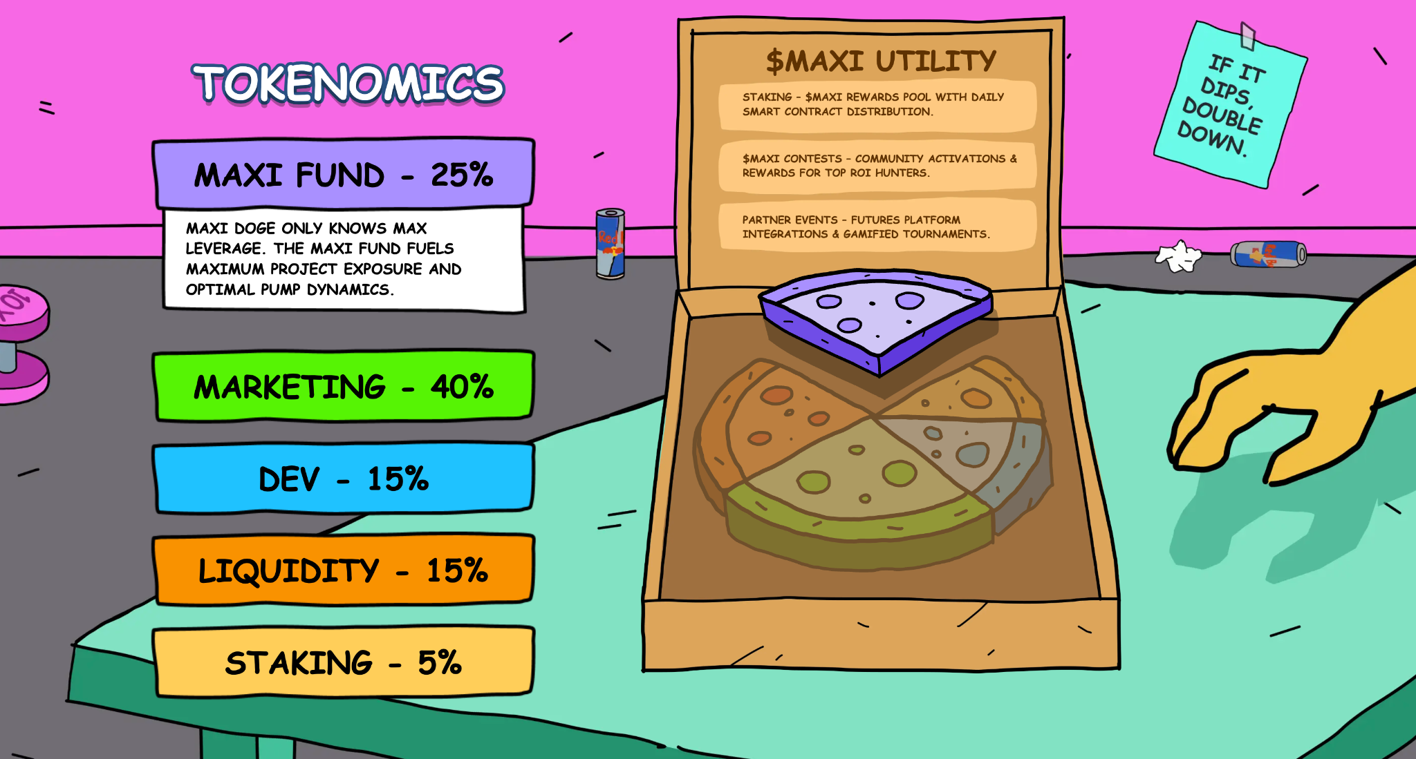 It carries the same viral, light-hearted appeal as Dogecoin but also builds on it. Its branding depicts Maxi as a juiced-up crypto bro who trades on 1000x leverage, but the project also offers real-world utilities that embody this energy.