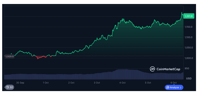 BNB (BNB) has been one of Uptober’s early winners, pushing past $1,200 to hit a new all-time high earlier today. The token is up 18% over the past week and 39% since last month, making it one of the market’s most bullish blue-chip plays.
