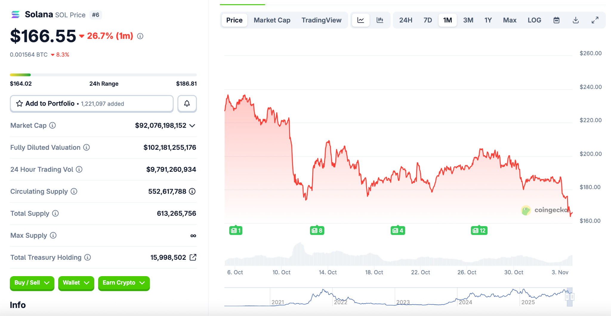 SOL was trading near $166, and some analysts project it could push toward $300 if network activity keeps climbing and institutional interest in Solana ETFs expands. The ecosystem remains one of the fastest and cheapest for DeFi applications, keeping developers building and users transacting.