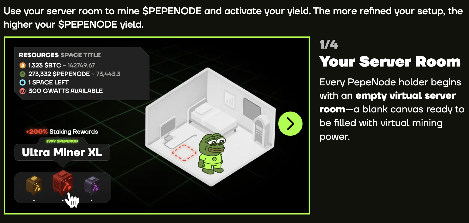 Here’s how it works: users start with an empty server room, then spend PEPENODE tokens to fill it with Miner Nodes and generate mining power. The more power they generate, the more PEPENODE tokens they will earn.