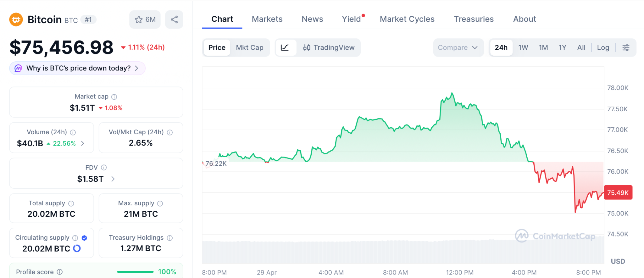 Bitcoin (BTC) Price at $75,456 as Rejection at $80,000 Meets Institutional Buying