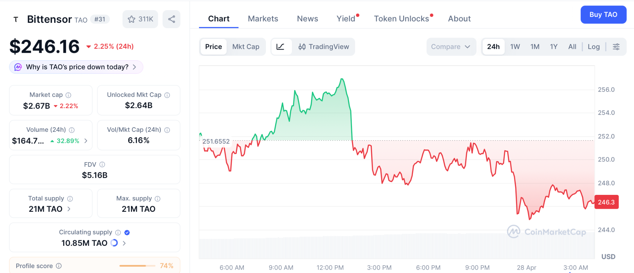 Bittensor (TAO) trades at $246 per CoinMarketCap, down 2.25% in 24 hours with a $2.4 billion market cap. NVIDIA’s $420 million staked position shows deep commitment, and Grayscale filed for a spot TAO ETF with an SEC decision expected by August 2026.