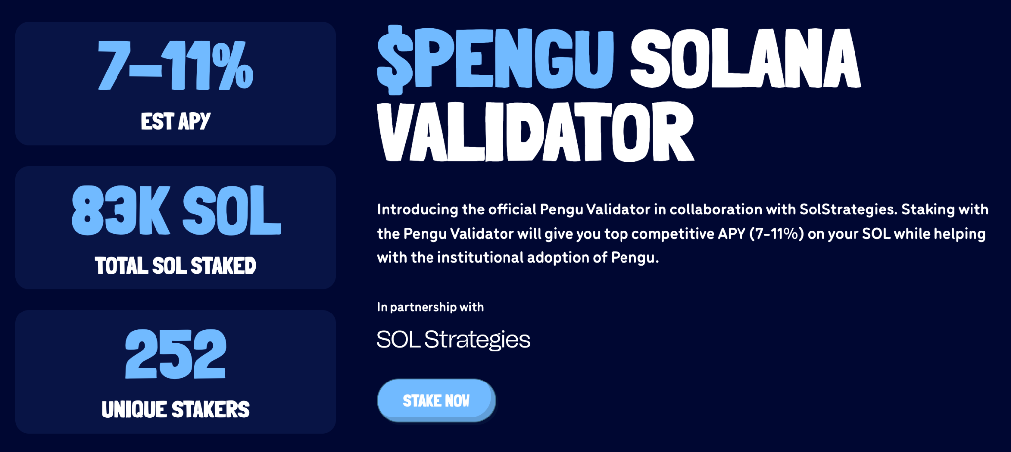 The project began as an NFT collection in 2021 and has since introduced a range of features, including its meme coin, as well as real-world collectible items and a smartphone game. The team has also partnered with Sol Strategies to operate a Solana validator, enabling the PENGU community to delegate SOL tokens and earn a competitive APY ranging from 7% to 11%.