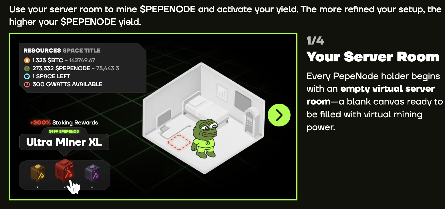 They start with an empty server room and spend PEPENODE tokens to buy Miner Nodes, which generate mining power. They can upgrade nodes and combine different types to boost output, and rewards are based on how much they generate.