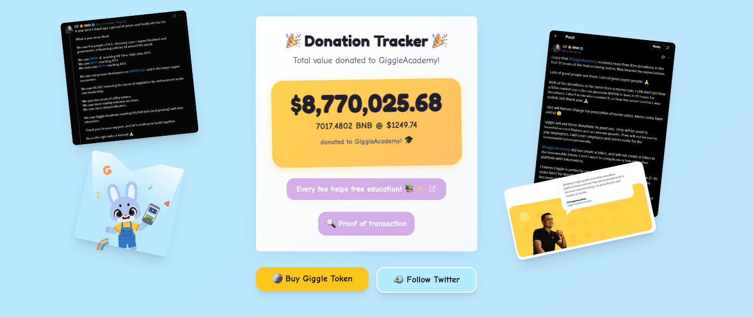 Giggle Fund (GIGGLE) is taking a different approach with a charity-first model. Built on the BNB Smart Chain, every buy and sell triggers a 5% tax, with half of the proceeds donated to charity. In just a few weeks since launch, that setup has generated over $8.7 million in donations.