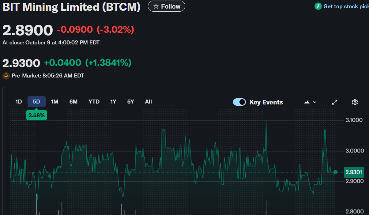 BIT Mining Limited (NYSE: BTCM) reported a 3.02% drop on October 9, closing at $2.89. However, the stock reversed direction in pre-market trading, climbing 2.08% to $2.95. This movement coincided with a major company announcement regarding its corporate identity and market positioning.
