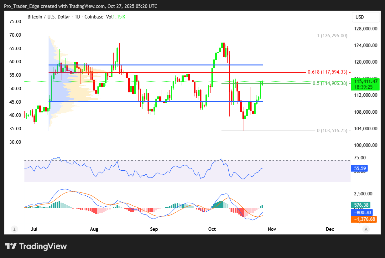 The recent price move represented a recovery from a swing low of $106,718 to a high of $115,400. Bitcoin is consolidating above the 23.6% Fibonacci retracement level of this recent wave.