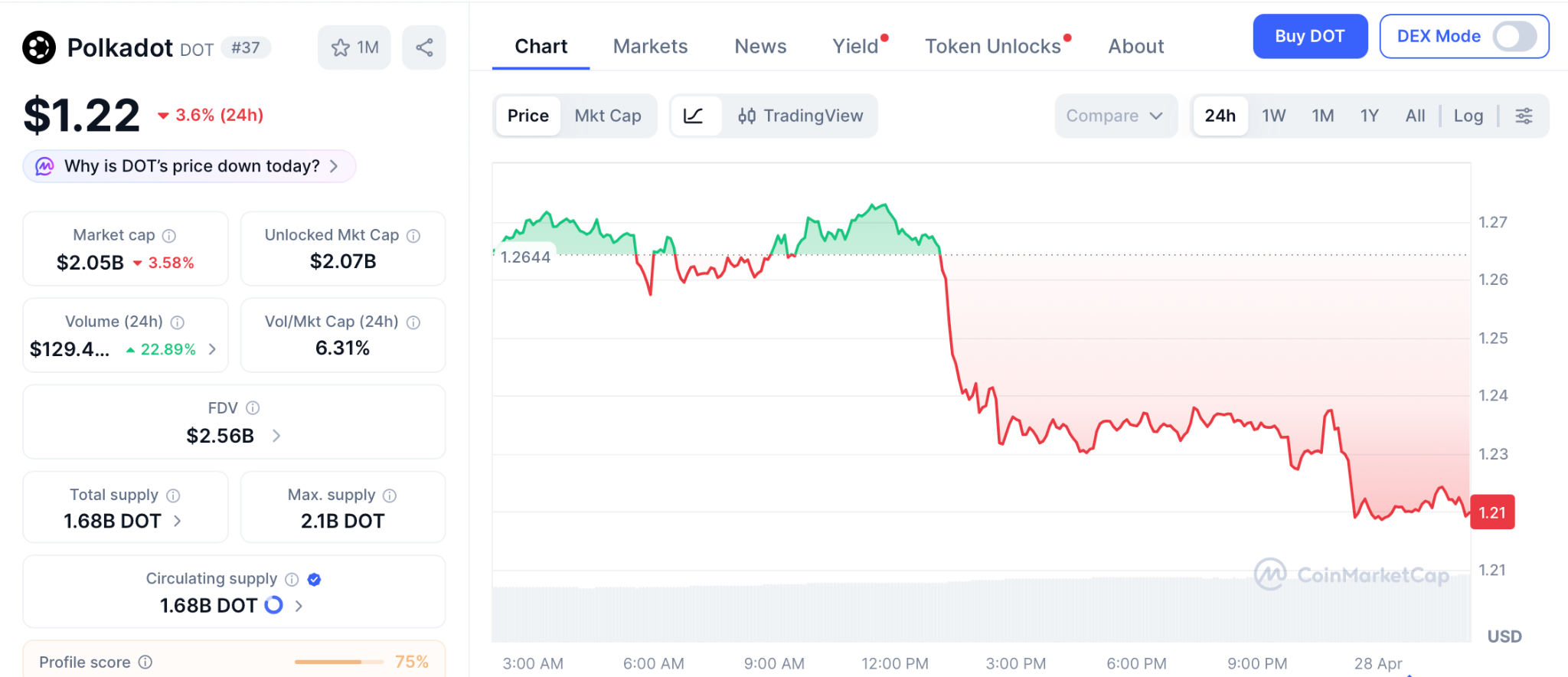 Polkadot (DOT) trades near $1.22, according to CoinMarketCap. The March supply cap at 2.07 billion tokens and 53.6% emissions cut lowered annual inflation to 3.1%.