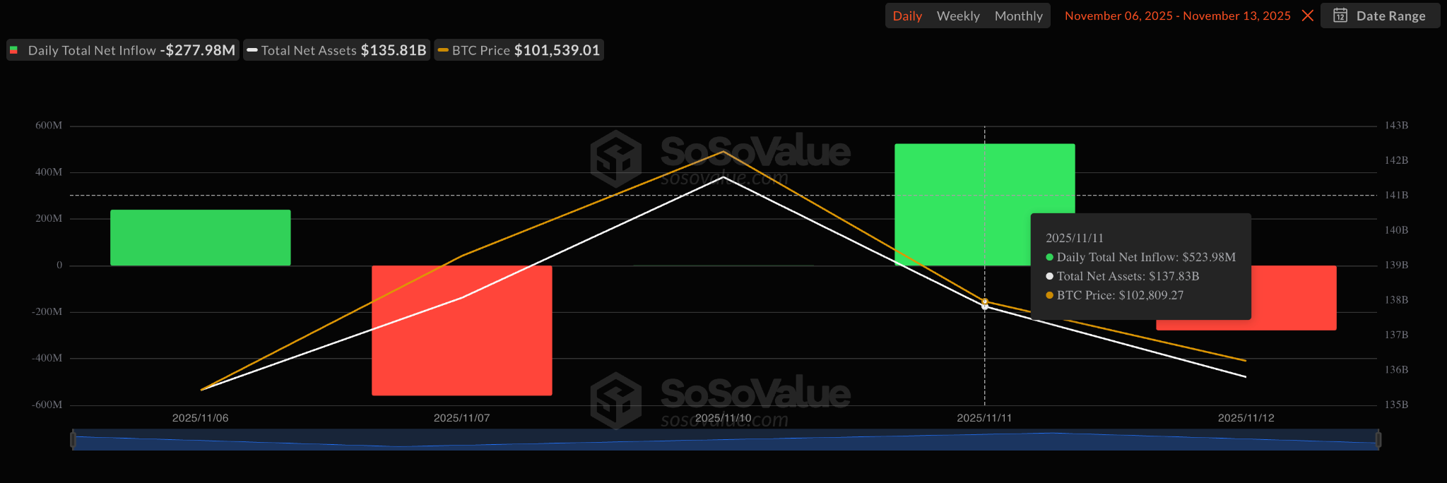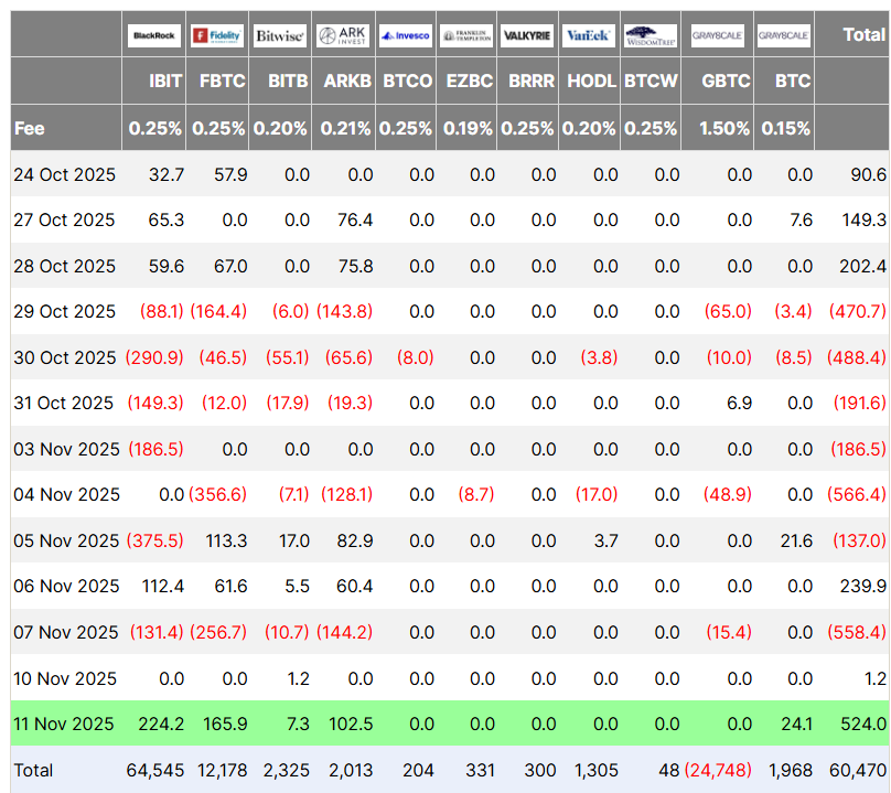 US spot Bitcoin ETFs recorded $524 million in net inflows on November 11, their best single-day performance since the brutal October 10 market crash. The return of this level of institutional demand is a strong signal that risk appetite is picking up again.